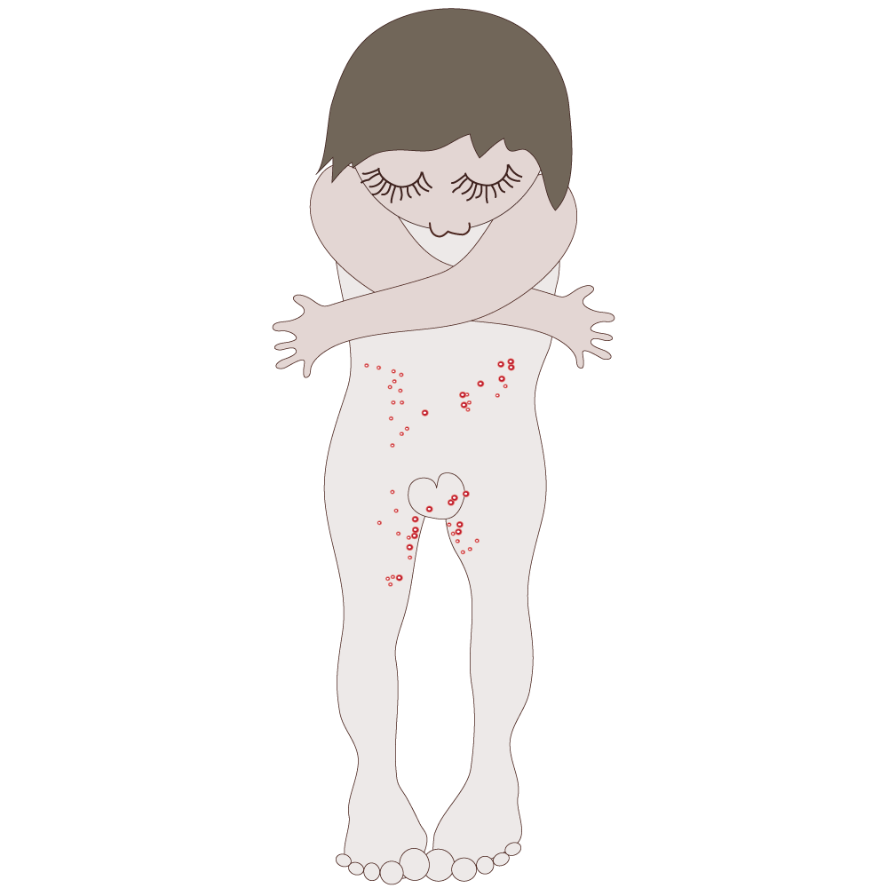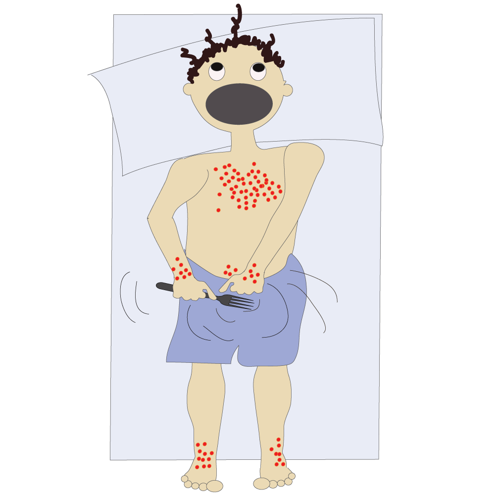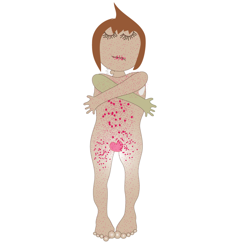 Description: An intensely itchy, contagious skin infestation of the parasitic mite. The adult female mite is barely visible to the human eye, with the male being half that size. Female mites burrow into the outer layer of the skin to lay eggs.