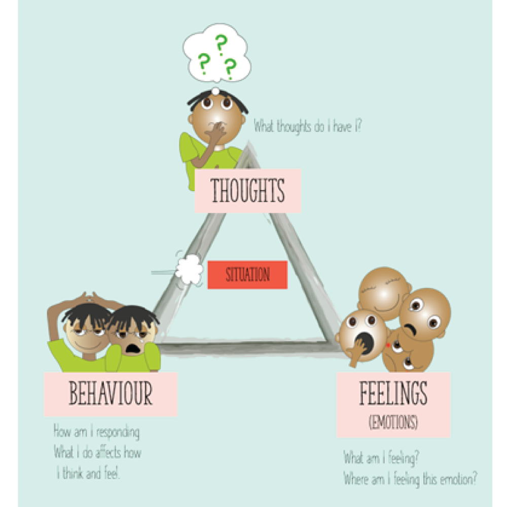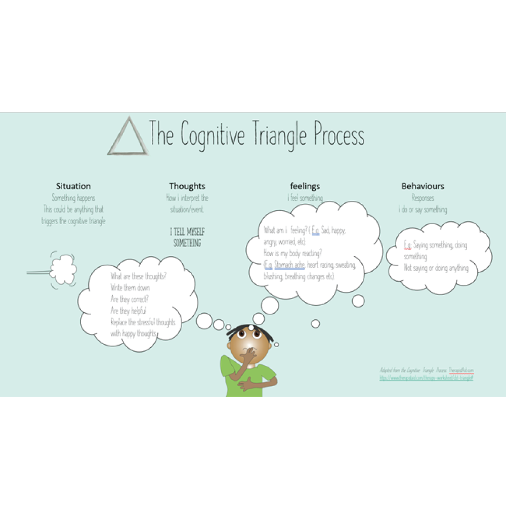The cognitive triangle illustrates how thoughts, emotions, and behaviours affect one another. This idea forms the basis of Cognitive Behaviour Therapy (CBT).
